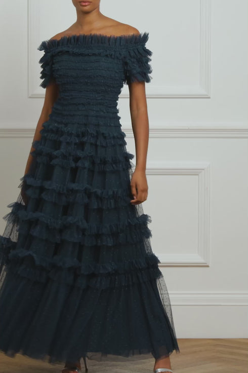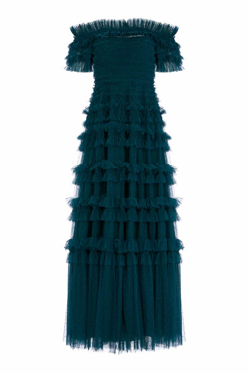 The Lisette Ruffle Off Shoulder Gown in Emerald. This statement gown has an elegant off-the-shoulder design inspired by Hollywood styling. Crafted with textile tulle and double-stitched frills for a dramatic, romantic effect. Features an integrated corset for a perfect fit and to hold the silhouette. Expect all eyes on you in this romantic gown.