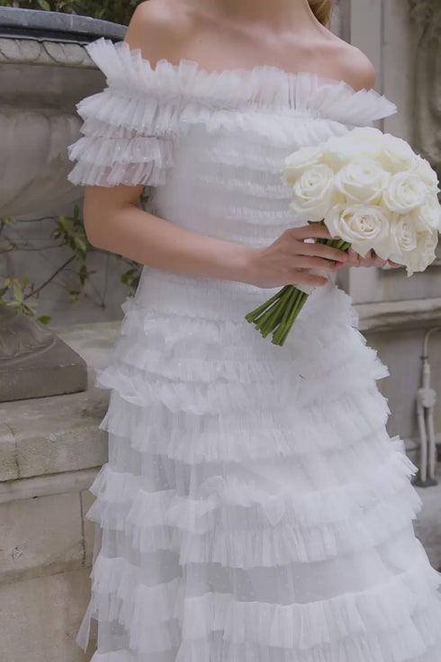 NEW SEASON | NEEDLE & THREAD EXCLUSIVE. The Lisette Ruffle Off-Shoulder Gown in Swan White. A statement off-shoulder gown adorned with cascading ruffles that enhance the silhouette with graceful movement. The softly structured bodice flows into a fluid skirt for timeless elegance.
