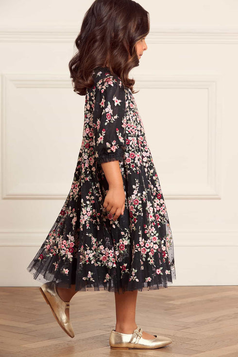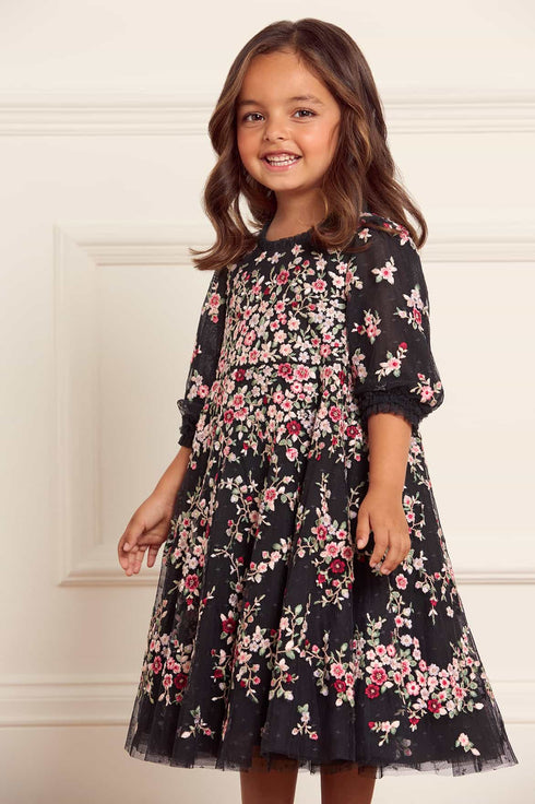 The Lunaria Wreath KIDS Dress in Graphite/Multi. This beautifully decorated style is embroidered with delicate florals in a scattered garland artwork, inspired by an early 1900s design. This style is embroidered with rich pastel tones to create a perfect painterly effect. The playful puff sleeves are adorned with tulle ruffle tiers and delicate scattered floral motifs. Crafted with soft tulle frills at the shoulders and neckline, adds a playful, frothy texture. The skirt features generous layers of net and tulle, with a full hemline perfect for twirling. A pretty dress for your little one's next event.