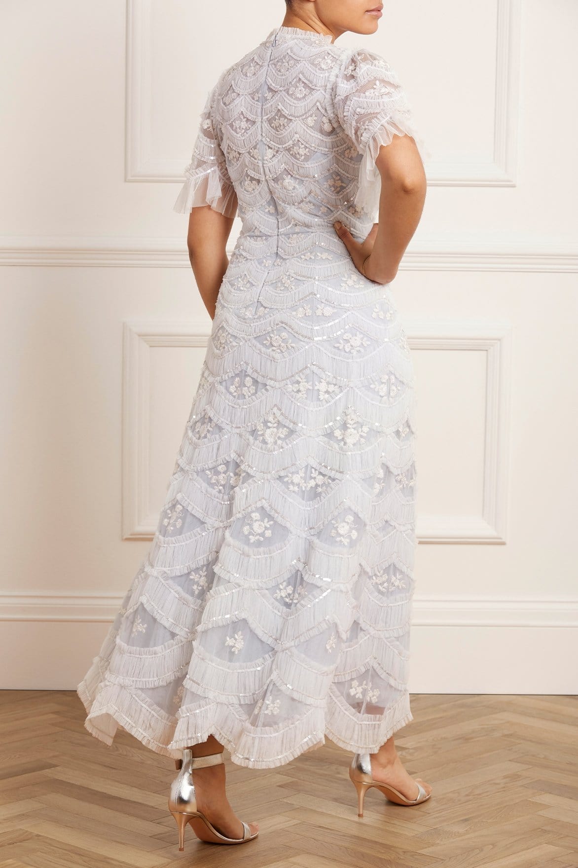 The Lunette Blossom Ankle Gown in Blue Mist This gorgeous gown is inspired by traditional Wedgwood ceramics, and is beautifully adorned with floral embroidery motifs, shimmering sequins and delicately gathered tulle scallop borders with contrasting ivory detail. Designed with pretty fluted sleeves, a flattering silhouette and a romantic aesthetic throughout. The perfect gown to take you from day to night.