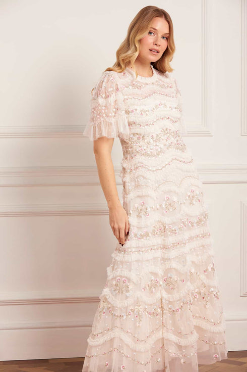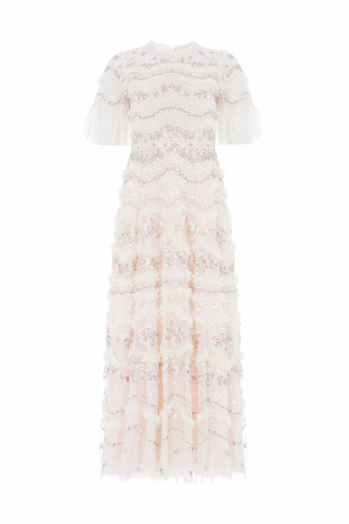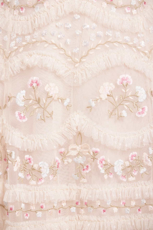 NEW SEASON. The Marina Ruffle Ankle Gown in Cream/Multi showcases delicate floral embroidery intertwined with soft frill detailing. Crafted from layers of tulle, this gown moves beautifully, capturing the spirit of feminine grace.