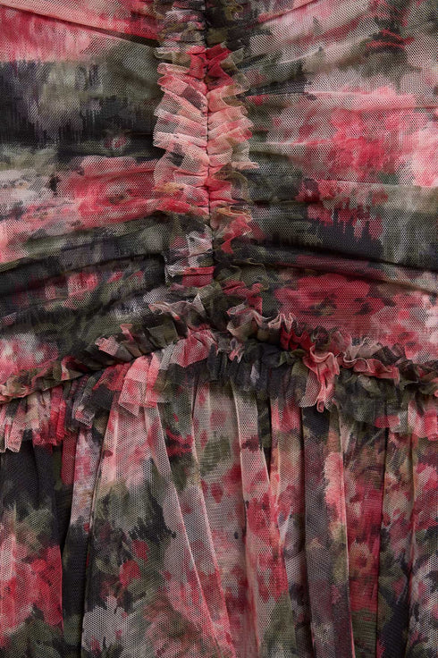NEEDLE & THREAD EXCLUSIVE. The Midnight Dance Strapless Ankle Gown in Graphite. Beautifully printed with a floral design featuring luxurious blooms taken from archive, hand-painted artwork from the early 1900s. This gown features a slim silhouette with soft, flattering drapes across the body. The statement fishtail skirt is crafted from layers of signature Needle & Thread soft tulle and net for added drama. The elegant V-neckline is adorned with frothy tulle ruffles, featuring long slim sleeves. Crafted with signature Needle & Thread frills on the shoulder, skirt seam, and bodice for a touch of romantic styling. This gown creates the most stunning movement as you walk.