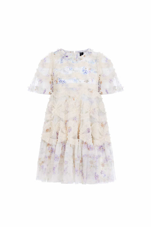 The Ophelia Ditsy Ingrid Kids Dress in Moonshine/Blue. This statement dress features Needle & Thread's signature ribbon bow motif, crafted in delicate tulle with subtle texture. A whimsical ditsy floral print, inspired by early 1900s hand-painted artwork, gives it a soft, floating feel. With a round neckline, floaty sleeves, and timeless design, it’s a must-have for your little one’s special occasions.