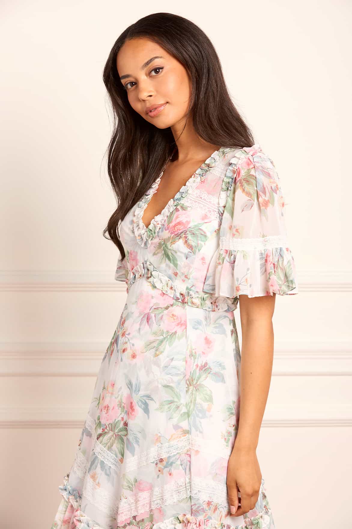 The Paradise Garden Sonata Georgette Ballerina Dress in Moonshine. The print of this dress is inspired by an enchanting paradise garden print, taken from an 1900s hand-painted artwork. This dress is designed with a luxe, twilight inspired colour palette in rich, lush floral motifs to create a truly alluring print. Developed in our soft, georgette fabric creating a flowing silhouette. Designed with Victorian inspired garments featuring a lace insert detailing and panelling. A transitional day to night piece.