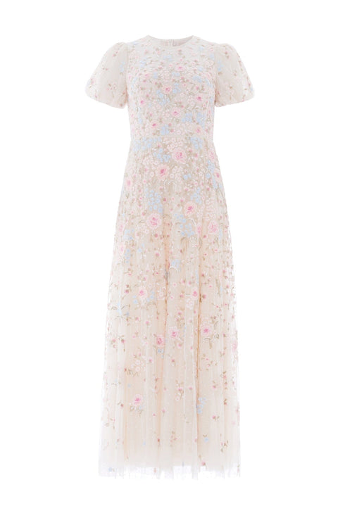 NEW SEASON. The Peony Bouquet Round Neck Ankle Gown in Cream/Multi. Adorned with delicate floral embroidery inspired by antique botanical paintings, this gown offers a refined, romantic silhouette. The round neckline and flowing ankle-length skirt create effortless elegance for special occasions.