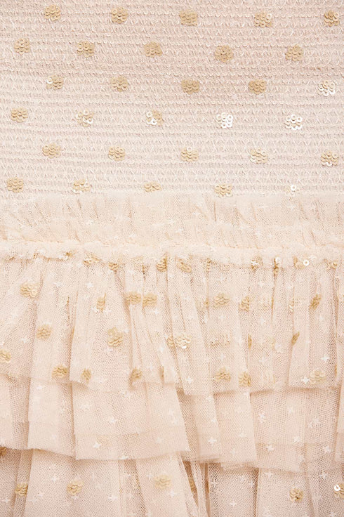 The Polka Dot Smocked Micro Mini Dress in Cream / Gold. A brand new statement style for the season ahead. Developed beautifully with signature, frothy tulle in fully stretch fabric for a fitted design. This dress is scattered with polka dot motifs in shimmer sequins to create a glistening effect. Adorned with a elasticated smocking body falling into a layered frothy tulle skirt for a playful, contemporary look. This dress features an off-shoulder design using elasticated layers of tulle to create comfort and signature Needle & Thread styling. We hope you adore this dress as much as we do.