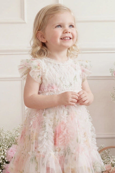 The Pompadour Garden Rosella Baby Dress in Moonshine/Cream. Inspired by the opulence of the Palace of Versailles, this dress features hand-painted floral bouquets and trailing ditsy motifs. The frothy tulle bodice is adorned with crosshatch frills that flow into a scalloped hem, with playful contrast-coloured frills for added charm. Signature Needle & Thread frills accent the neckline, waist, and shoulders. Soft tulle short sleeves and a cotton voile lining ensure comfort, while matching cotton dobby bloomers, finished with frills, complete the look. A cherished piece for your little one’s special moment.