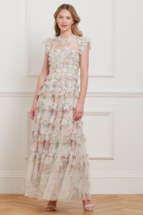 The Pompadour Garden Round Neck Gown in Moonshine. Inspired by the opulent wall coverings of the Palace of Versailles, this gown features luxurious hand-painted floral bouquets and trailing ditsy motifs, exuding timeless elegance. The frothy short sleeves, crafted from gathered tulle frills, add a romantic touch, while signature Needle & Thread frills adorn the neckline. Delicate scalloped borders and frills create a textured, ethereal effect throughout, making this gown a true embodiment of luxury and artistry.