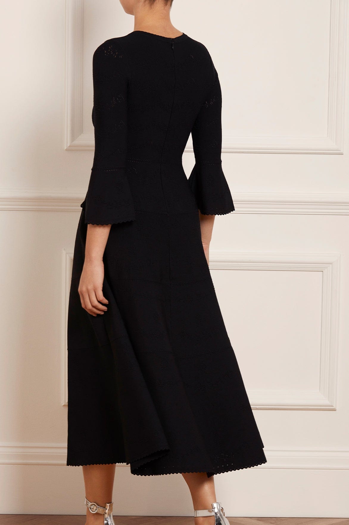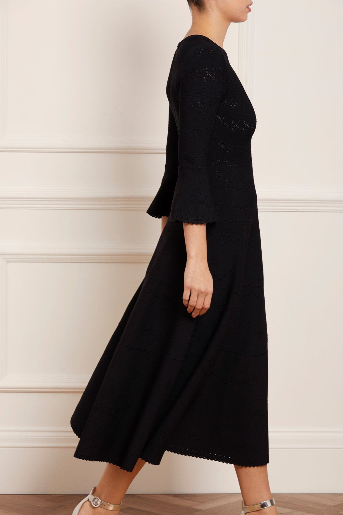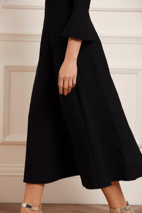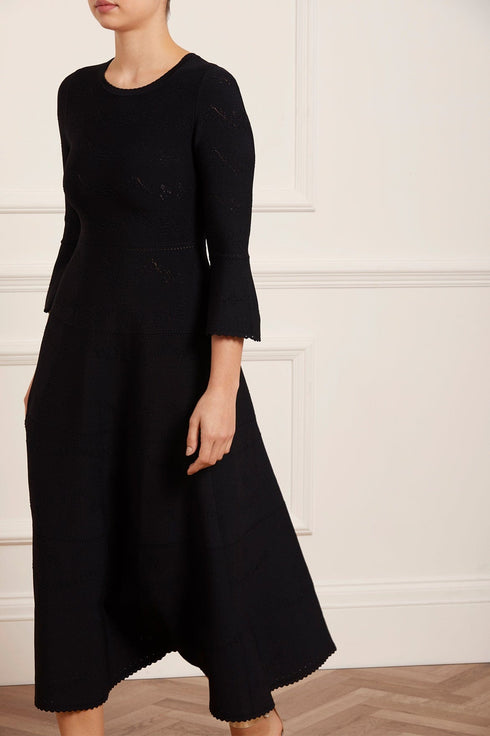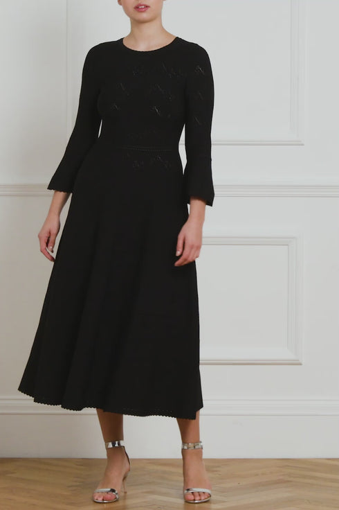 The Pretty Pointelle Knit Ankle Gown in Black. A brand new style for Needle & Thread. This knitted gown is inspired by vintage ditsy florals and lace. Beautifully designed with all-over pretty pointelle stitch, delicate florals and scallop details. This gown has a fitted stretch bodice with a soft, round neckline, fluted cuffs and signature Needle & Thread detailing. A truly flattering piece.
