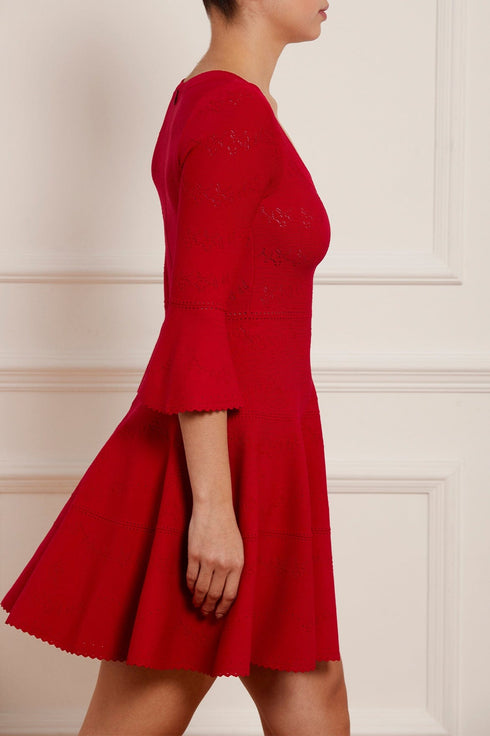 The Pretty Pointelle Knit Scoop Neck Mini Dress in Red. A brand new style for Needle & Thread. This knitted dress is inspired by vintage ditsy florals and lace. Beautifully designed with all-over pretty pointelle stitch, delicate florals and scallop details. This dress has a fitted stretch bodice with a soft, feminine neckline, fluted cuffs and signature Needle & Thread detailing. A truly flattering piece.
