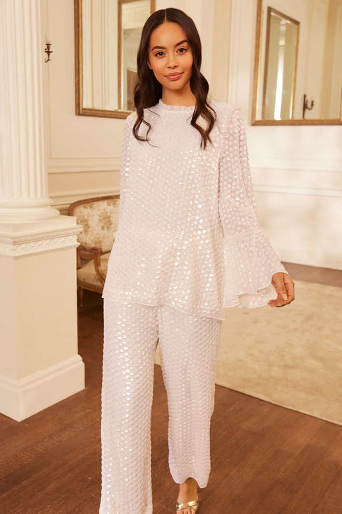 The Raindrop Gloss Tunic in Cream. This top is beautifully adorned with scattered sequins, adding a romantic, shimmering effect. Designed with the most exquisite sequins with an extra foil coating to create an ultra-high shine finish. This relaxed tunic is designed with an easy-wear, loose fit silhouette. Developed with exaggerated cuff details and voluminous, gathered frill for signature Needle & Thread details. Pair with the matching Raindrop Gloss Skirt for the full Needle & Thread look.