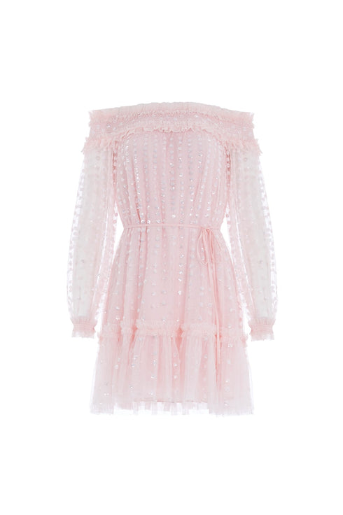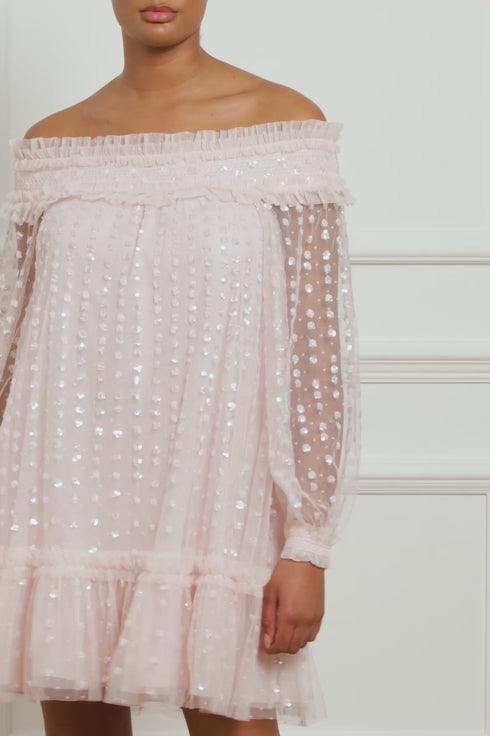 The Raindrop Smocked Gloss Off-Shoulder Micro Mini Dress in Peony Pink. Beautifully decorated with shimmering sequins dispersing down the body. This dress is developed with an off-the-shoulder design with signature Needle & Thread frills for an elegant look. This romantic style is crafted with a loose-fit, whimsical silhouette featuring a delicate fabric belt for versatile styling. A piece you'll forever treasure.