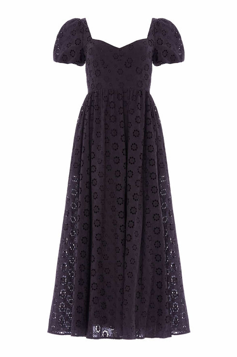 NEW SEASON | NEEDLE & THREAD EXCLUSIVE. The Romilly Cotton Broderie Ankle Gown in Jet Black. This elegant ankle gown is designed in delicate cotton broderie featuring trailing daisy embroidery. The flattering silhouette balances gentle structure with flowing movement, creating a timeless shape.