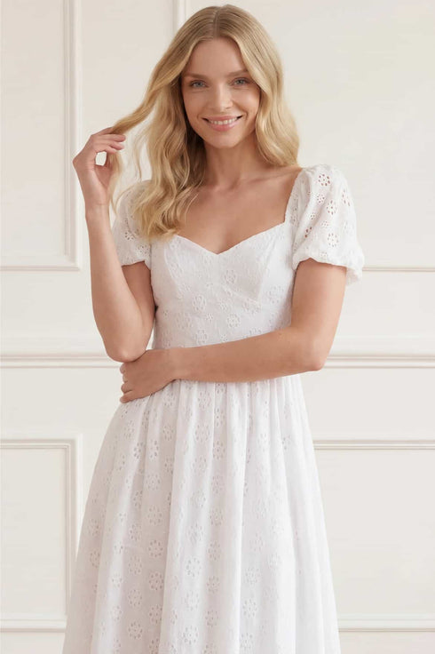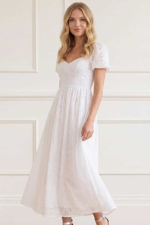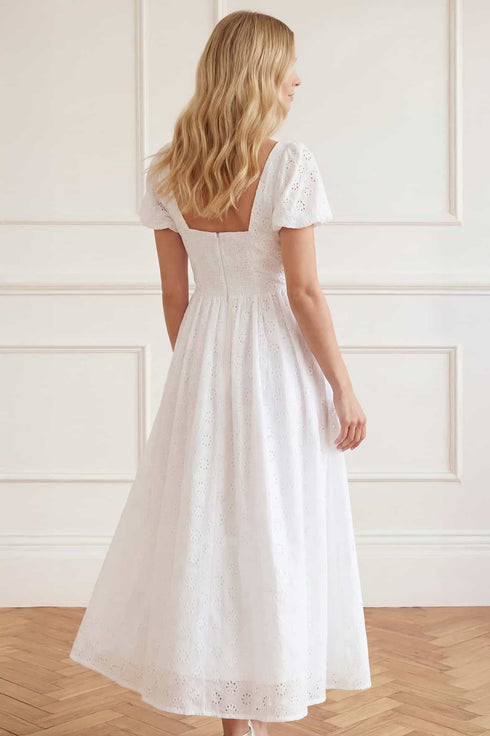 NEW SEASON. The Romilly Cotton Broderie Ankle Gown in Optic White. Crafted from beautiful cotton broderie depicting trailing daisy motifs, this ankle-length gown embodies romantic summer dressing. The softly structured bodice flows into a fluid skirt for graceful movement and natural ease.