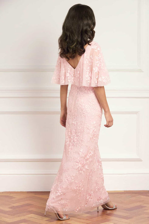 NEW SEASON. The Rosa V-Neck Cape Gown in Peony Pink. Adorned with delicate floral embroidery inspired by early 1900s artwork, this gown offers a refined, romantic silhouette. Finished with an integrated cape and a slim fit, enhanced by a bias-cut lining for fluid movement.