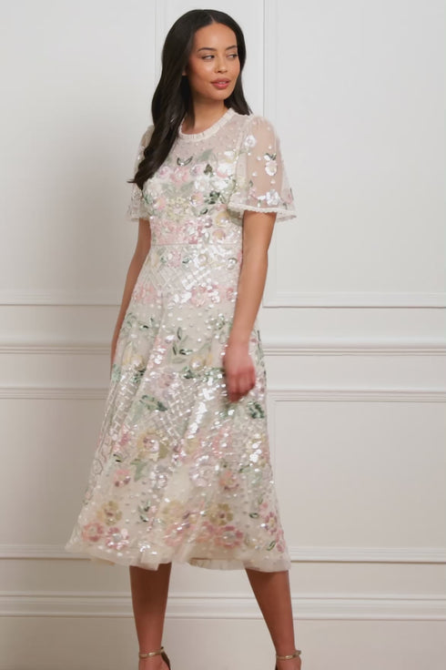 The Rosalie Short Sleeve Ballerina Dress in Cream. A timeless design from Needle & Thread’s heritage collection, the Rosalie dress showcases refined artistry and elegance. The statement multicolour sequin embroidery forms delicate floral motifs in linear bands, accented with intricate dotted and crosshatch details for added depth. Signature tulle frills frame the neckline and armholes, while the short sleeves are finished with shimmering sequins and a delicate lace-trimmed cuff. The skirt, made from layers of soft tulle, falls into a graceful, romantic silhouette. A true celebration of luxury, detail, and timeless design.
