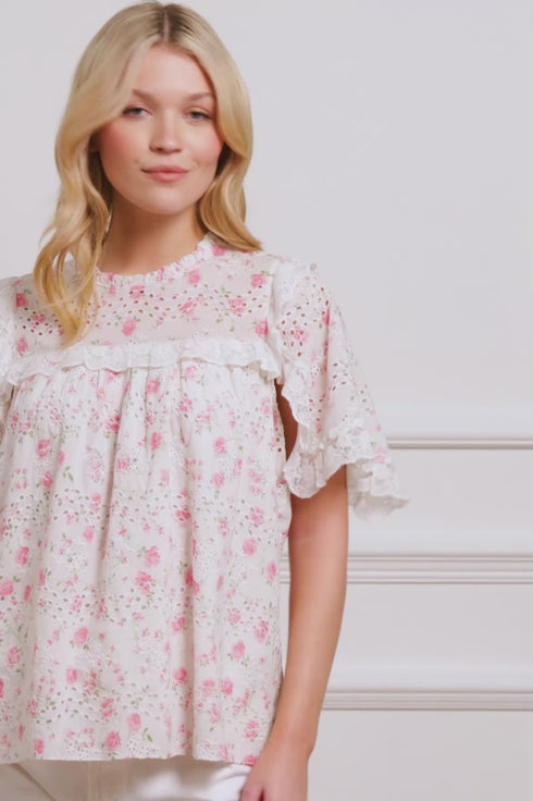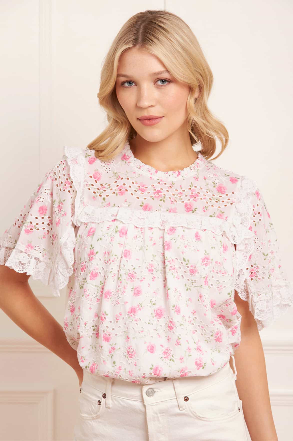 The Rose Ditsy Cotton Broderie Top in Moonshine/Pink features a romantic floral print inspired by 1800s hand-painted wallpaper. Crafted from broderie anglaise cotton, it showcases delicate floral scallop embroidery. The handkerchief sleeves and yoke are edged in gathered lace for added elegance. With a relaxed fit, this top offers comfort and ease, while signature Needle & Thread frills at the neckline add a feminine finishing touch.