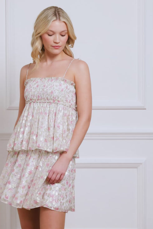 The Rose Ditsy Lurex Micro Mini Skirt in Moonshine/Pink. This skirt features a romantic floral print inspired by 1800s hand-painted wallpaper, with delicate ditsy motifs. Made from glittering gold lurex georgette, it’s enhanced with a subtle leopard print for added depth. The shirred waistband is trimmed with signature Needle & Thread frills, while the softly gathered mini skirt creates a playful, feminine silhouette. Pair with the Rose Ditsy Lurex Off-Shoulder Top for an effortlessly elegant look.