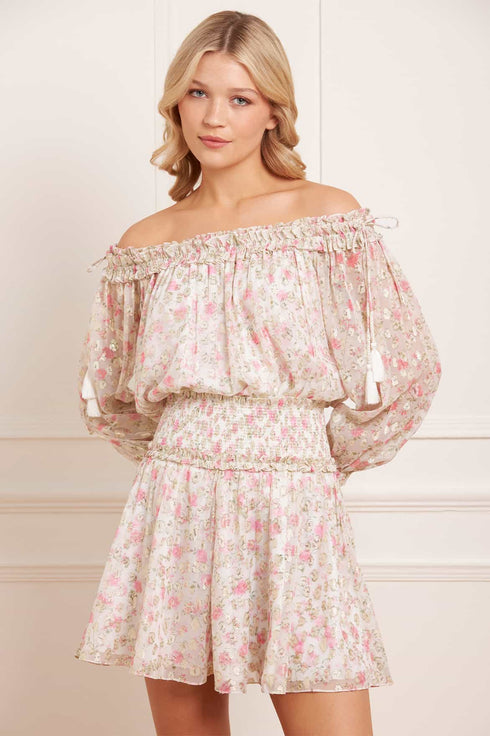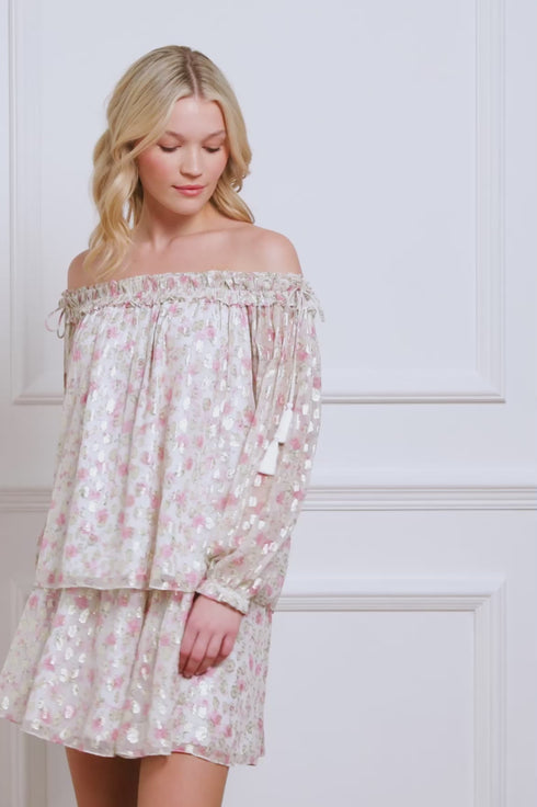 The Rose Ditsy Lurex Off-Shoulder Top in Moonshine/Pink. This top features a romantic floral print inspired by 1800s hand-painted wallpaper, with a subtle leopard print on glittering gold lurex georgette. The off-the-shoulder shirred neckline is edged with signature frills, while braided silk tassels add an elegant touch. Developed with blouson sleeves with ruffle cuffs enhance the romantic feel. With a relaxed fit, this top pairs perfectly with the Rose Ditsy Lurex Micro Mini Skirt for a complete look.