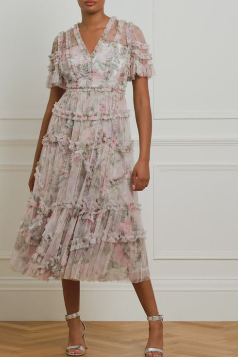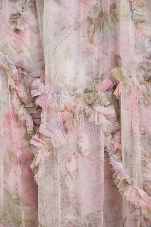The Rose Powder Ruffle Ballerina Dress in Moonshine. This dress is inspired by a 1900s hand-painted wallpaper design. Beautifully printed with florals in faded pastels for a vintage look. This dress is crafted with signature Needle & Thread styling featuring tulle ruffles and layers of delicate tulle, creating pretty, effortless movement. A wardrobe treasure you'll forever hold onto.