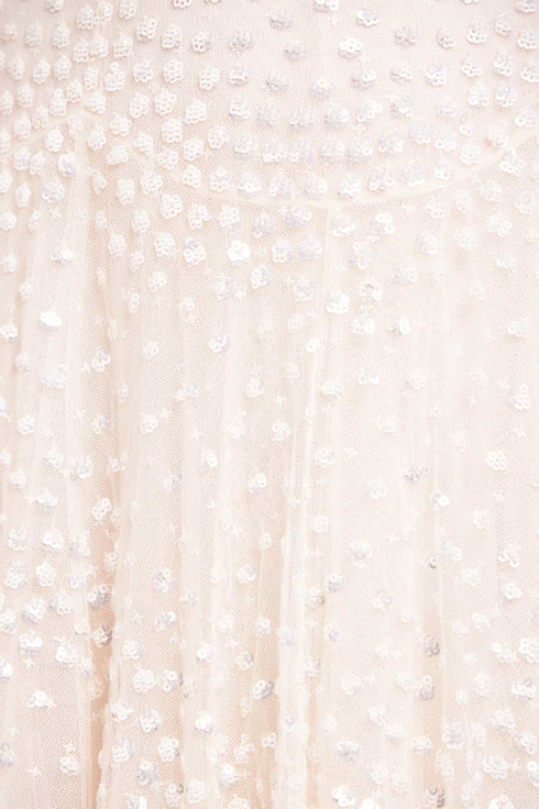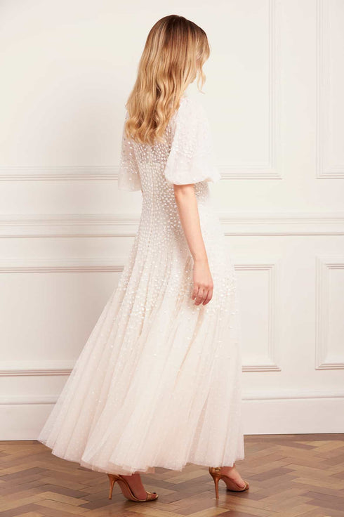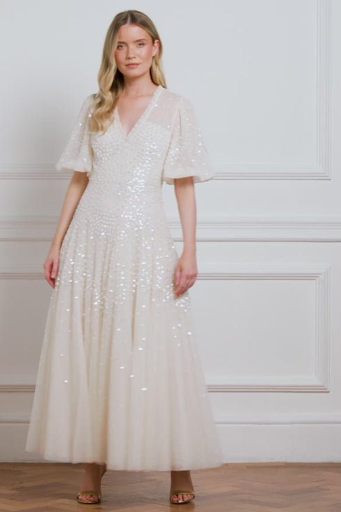 NEW SEASON. The Scallop Sequin V-Neck Ankle Gown in Cream. Decorated with glistening sequin clusters that gently fade toward the hem. Designed with a flattering V-neckline and flowing silhouette, this gown radiates elegance and soft luminosity.