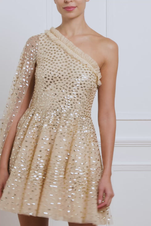 The Scatter Dot One-Shoulder Mini Dress in Antique Gold. This embellished dress is decorated with exquisite shimmering dot motifs, undulating in wave formations for a captivating glittering effect. This dress features a sweeping floor-length cape sleeve for romantic detailing and a statement look. The flattering one shoulder neckline is trimmed with signature Needle & Thread tulle frills. The skirt is made up of generous layers of net and tulle with sweeping hemline. The perfect dress for an upcoming special occasion.