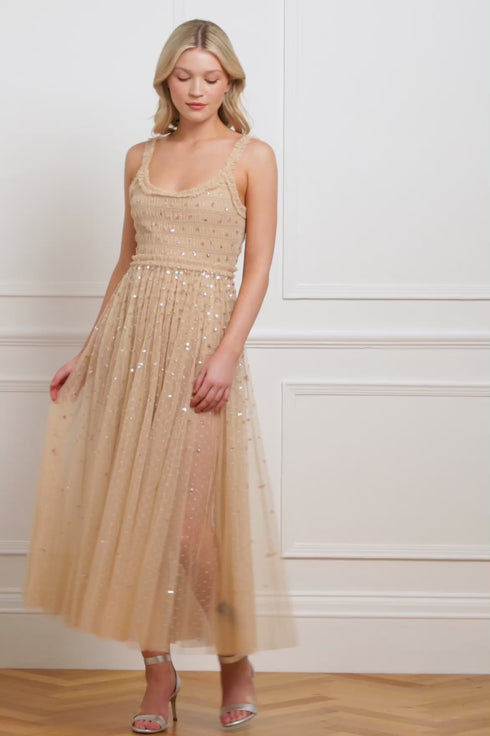 The Sequin Giselle Smocked Cami Ankle Gown in Butterscotch. This refined party gown features a scoop neckline, slim camisole straps, and a shirred bodice for a flattering fit. Signature Needle & Thread frills adorn the neckline and waist, while glittering sequin dot motifs cascade down the sheer, floaty skirt. Finished with an integrated power mesh bodysuit for comfort and support, this piece is a graceful blend of romance and sparkle—perfect for special occasions.