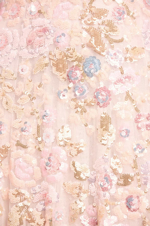 NEW SEASON | NEEDLE & THREAD EXCLUSIVE. The Sequin Paradise V-Neck Gown in Opal/Multi. A statement evening gown adorned with shimmering high-gloss sequins forming vibrant floral bouquets. The flattering V-neckline and softly flowing skirt create graceful movement, while the embellishment fades delicately towards the hem.