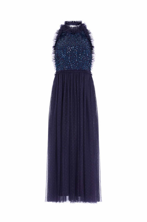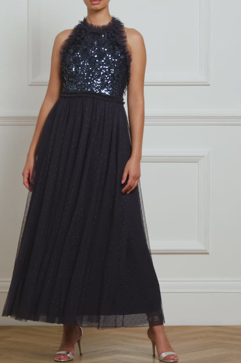 The Sequin Wreath Bodice Halter Neck Ankle Gown in Navy. This beautiful gown is crafted with an elegant halter neck shape and backless design. Designed with a signature Needle & Thread layered tulle skirt and tulle frills. The bodice of the gown is adorned with rich, shimmering sequins in a floral artwork. Shine under the spotlight in this magical style.