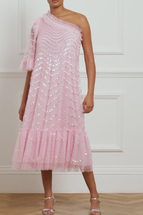 NEW SEASON. The Shimmer Wave Gloss One-Shoulder Ballerina Dress in Blossom Pink. This ballerina dress is developed with a one-shoulder design and a generous, voluminous sleeve for elegant detail. Adorned with a shimmering artwork in high gloss sequins. This style is inspired by the sea waves of the Riveria, featuring delicate sequins creating undulating borders for a romantic, glistening effect. The skirt is made up of layers of signature Needle & Thread soft tulle. A Needle & Thread season favourite.