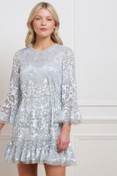 The Snowdrop Mini Dress in French Blue. A heritage Needle & Thread design, this timeless dress features shimmering sequin artwork inspired by antique tablecloths from the early 1900s. Intricate floral borders and lattice patterns create a striking, heirloom-like embellishment. Designed for effortless elegance, the dress has a relaxed fit with a slim crepe waist tie for versatile styling. Crafted with romantic fluted sleeves, a softly tiered hem, and signature frill detailing at the neckline complete the look.