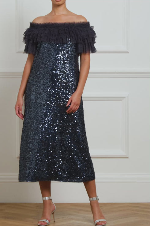 The Stephanie Ballerina Dress in Navy. A brand new party style for the season ahead. Beautifully crafted with a statement ruffle off-the-shoulder design, developed from layers of tulle and net to create this playful look. The neckline and sleeves are fully elasticated along the top edge for comfort. Decorated with rich, shimmering sequins to create an enchanting, glistening effect. Expect all eyes on you in this magical, fun style.
