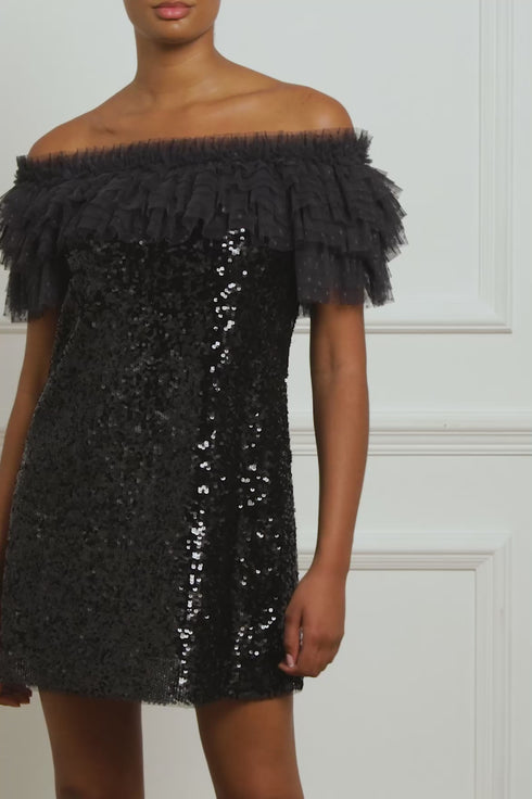 The Stephanie Micro Mini Dress in Graphite. A brand new party style for the season ahead. Beautifully crafted with a statement ruffle off-the-shoulder design, developed from layers of tulle and net to create this playful look. The neckline and sleeves are fully elasticated along the top edge for comfort. Decorated with shimmering, rich sequins to create an enchanting, glistening effect. Expect all eyes on you in this magical, fun style.