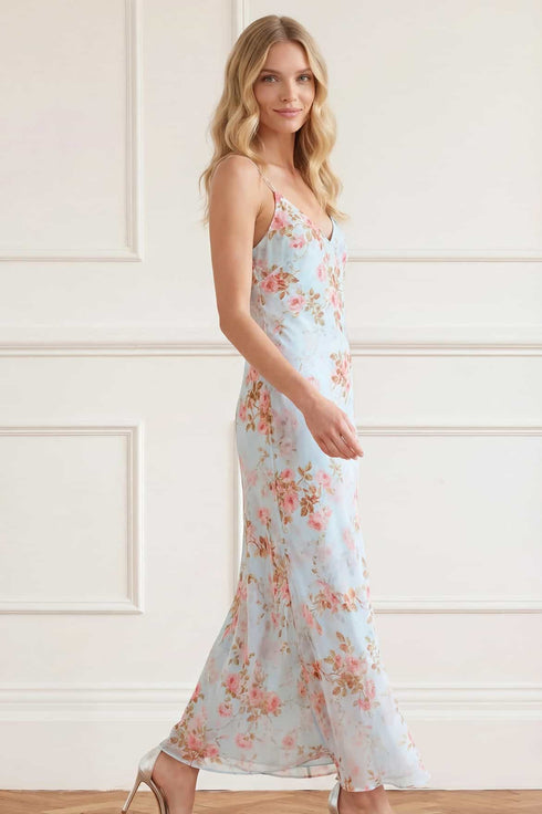 NEW SEASON | NEEDLE & THREAD EXCLUSIVE. The Summer’s Rose Georgette Cami Gown in Aqua. Featuring the exquisite Summer’s Rose print inspired by archival trailing florals, this cami gown is crafted in fluid georgette. Cut on the bias for a smooth, body-skimming fit and effortless wear, the silhouette moves beautifully from bodice to hem.