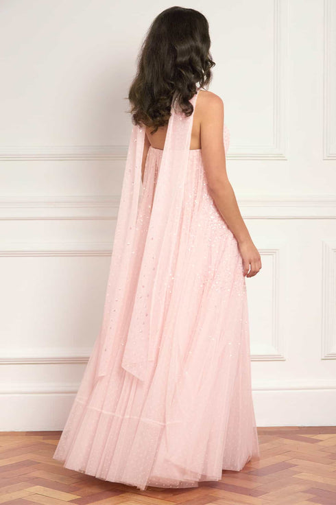 NEW SEASON. The Sunrise Sequin Strapless Cape Gown in Peony Pink. An elegant strapless gown adorned with softly shimmering sequin detailing inspired by glowing sunrise hues. Finished with a delicately gathered tulle cape at the back and a flowing full-length skirt for dramatic occasionwear. Perfectly paired with a matching scarf.