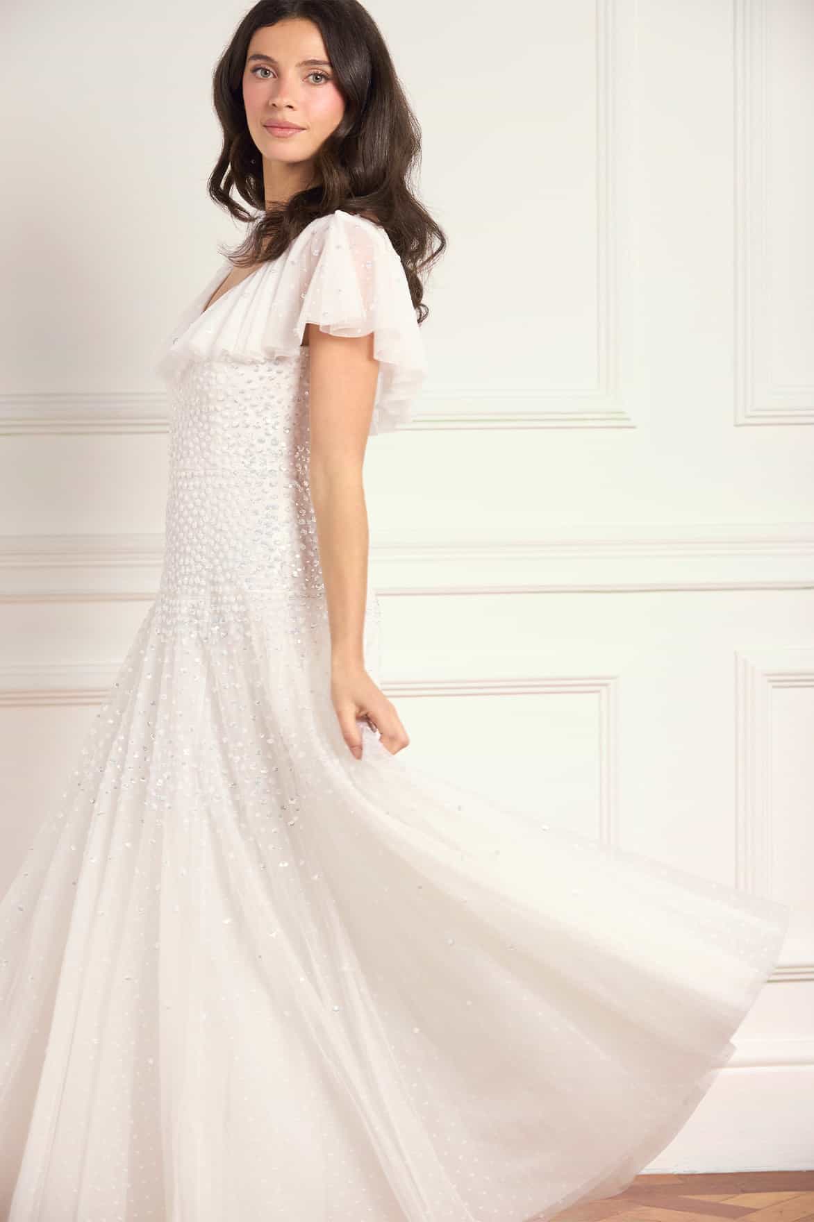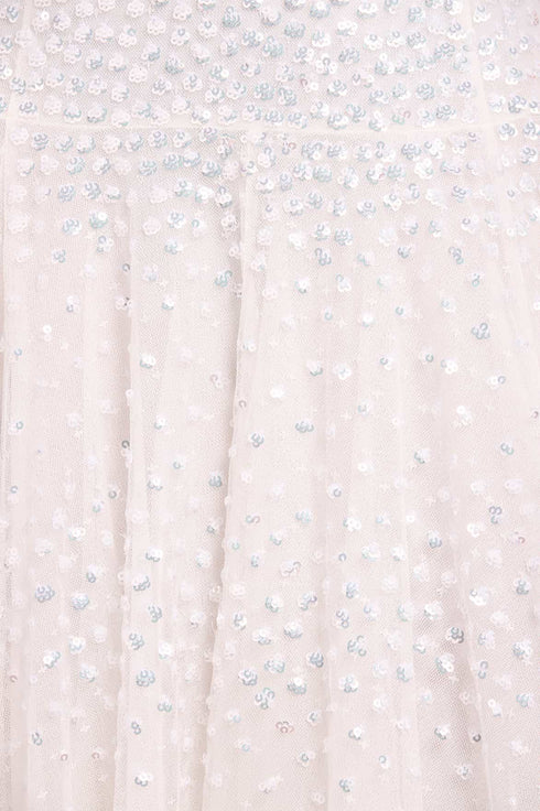 NEW SEASON | NEEDLE & THREAD EXCLUSIVE. The Sunrise Sequin V-Neck Ankle Gown in Swan White. This elegant ankle gown is adorned with luminous sequin dot motifs that create a subtle, shimmering effect. The flattering V-neckline elongates the silhouette, while the flowing skirt moves effortlessly with every step.
