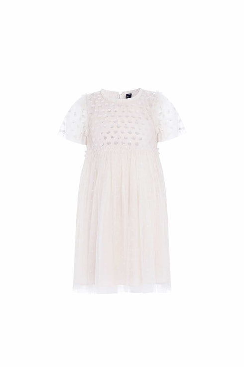 The Thea Bodice KIDS Dress in Cream / Silver. The bodice of this dress is beautifully adorned with sequin dot motifs creating a playful, shimmering effect. Designed with a signature Needle & Thread skirt, made with layers of frothy tulle. The perfect dress for an upcoming special occasion.