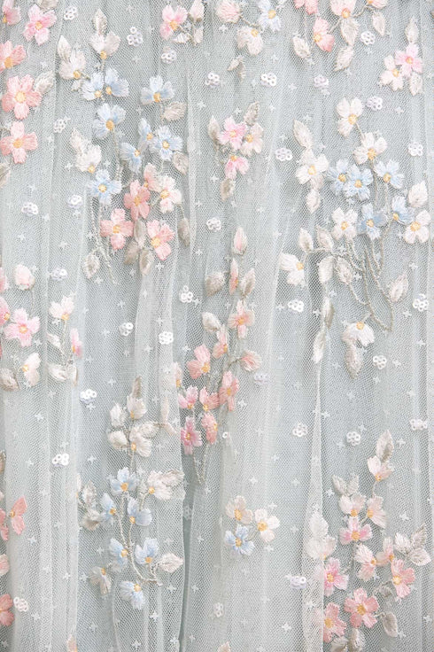 The Versailles Ditsy Cape Sleeve Ankle Gown in French Blue. Inspired by the opulence of Versailles, this gown features rich multicoloured floral embroidery across the bodice, trailing softly toward the hem. Decorated with high-shine sequin dot motifs add a touch of shimmer throughout. A square neckline trimmed with signature tulle frills and delicate embroidered cape sleeves enhance its romantic charm. Finished with a sweeping layered tulle skirt, this piece exudes elegance and grandeur.