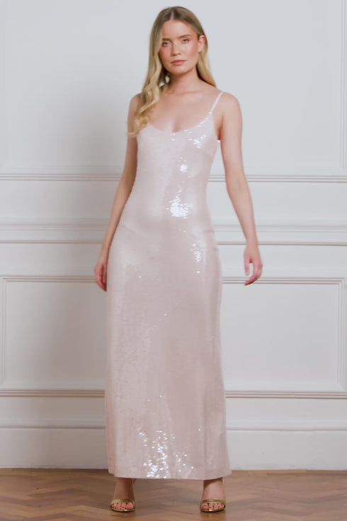 NEW SEASON. The Yvonne Sequin Cami Gown in Seashell. Cut on the bias for an elegant fit. Crafted from stretch mesh covered in shimmering sequins, this gown captures effortless movement and radiant light.