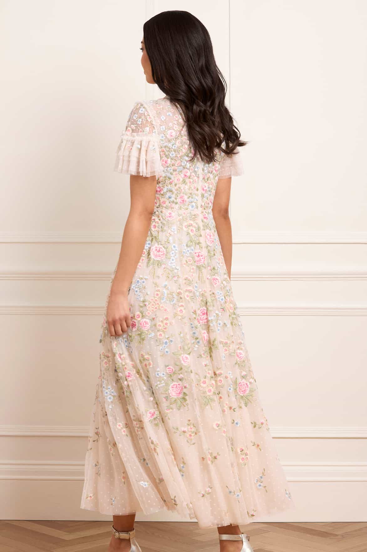 The Antoinettes Floral Round Neck Ankle Gown in Cream. A nod to the lavish beauty of Versailles, the Antoinette Gown showcases exquisite multicoloured floral embroidery, cascading in delicate clusters toward the hem. The round neckline is framed by signature Needle & Thread tulle ruffles, while short sleeves are finished with softly gathered tulle frills for a whimsical touch. Crafted with generous layers of net and tulle, the ankle-length skirt flows into a graceful, sweeping hemline—bringing timeless romance to any occasion.