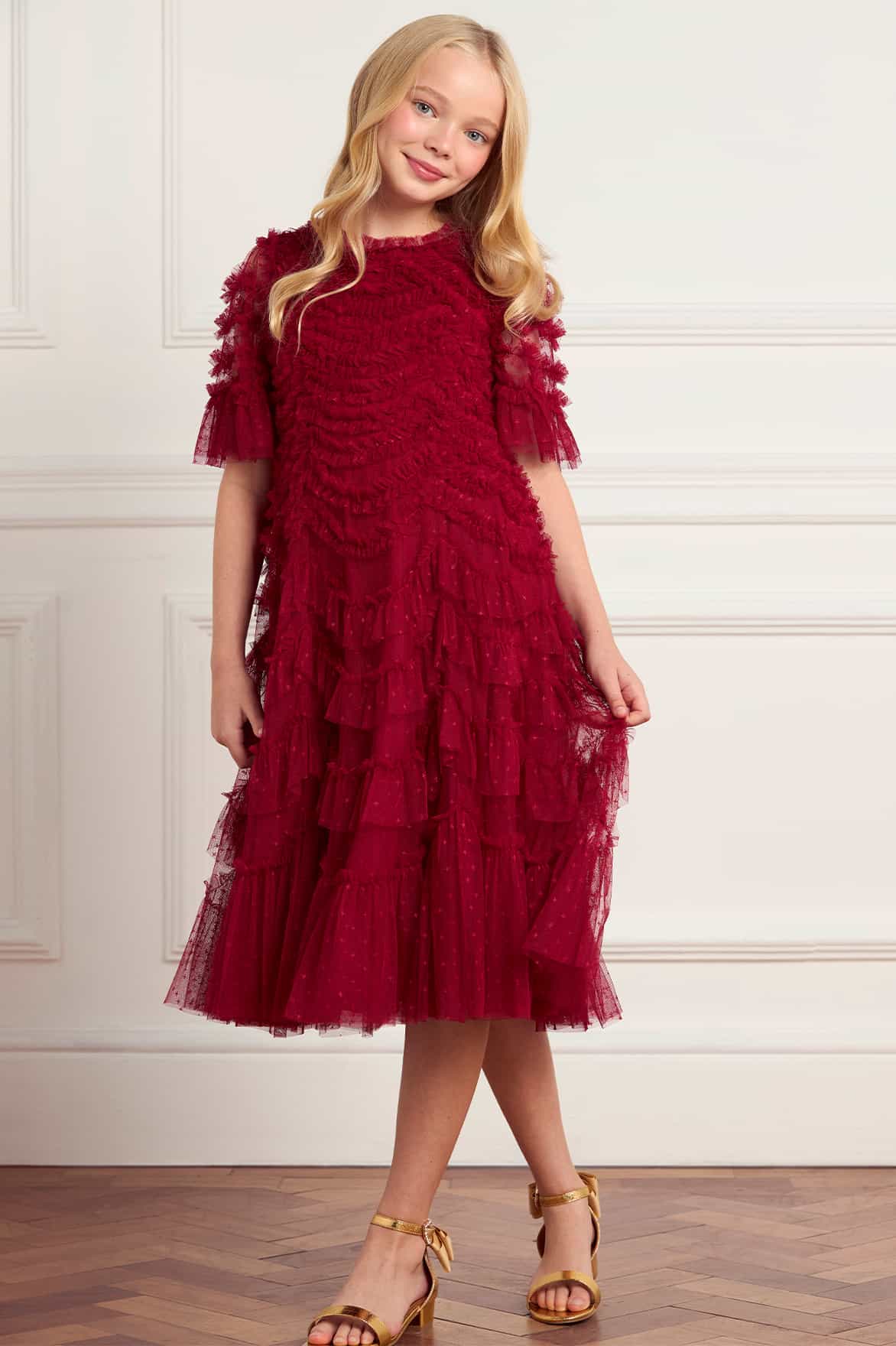 NEW SEASON. The Aviana Kids Dress in Red. A joyful burst of colour and texture. Designed with Needle & Thread’s signature scallop frills in delicate tulle, the dress balances playful volume with lightweight comfort. The bold red tone makes it a statement piece, ideal for festive occasions and family celebrations. Perfectly pairs with the Aviana Off-Shoulder Gown in Red from the adult collection for matching moments.