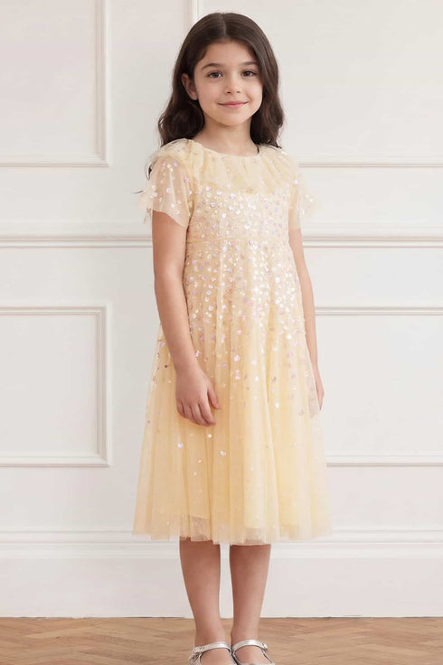 NEW SEASON. The Candy Dot Kids Dress in Lemon Sorbet/Multi. Designed with comfort and movement in mind, this kids dress features a relaxed shape and a full skirt perfect for twirling. Inspired by joyful garden blooms, it’s playful yet polished.