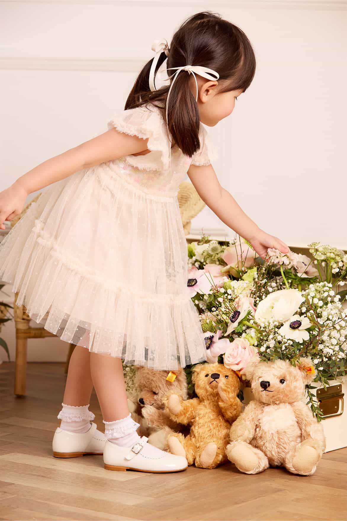 NEW SEASON. The Confetti Bodice Baby Dress in Cream/Multi. This dress features a sequin-embellished bodice with delicate floral motifs and confetti detailing. Soft tulle frills adorn the neckline, bodice, and shoulders, while frilled sleeves create a frothy effect. The gently gathered skirt is finished with playful frills for added volume. Lined in soft cotton voile for comfort, the set includes matching cotton dobby bloomers, delicately edged with frills. The perfect dress for your little one’s upcoming special occasion.