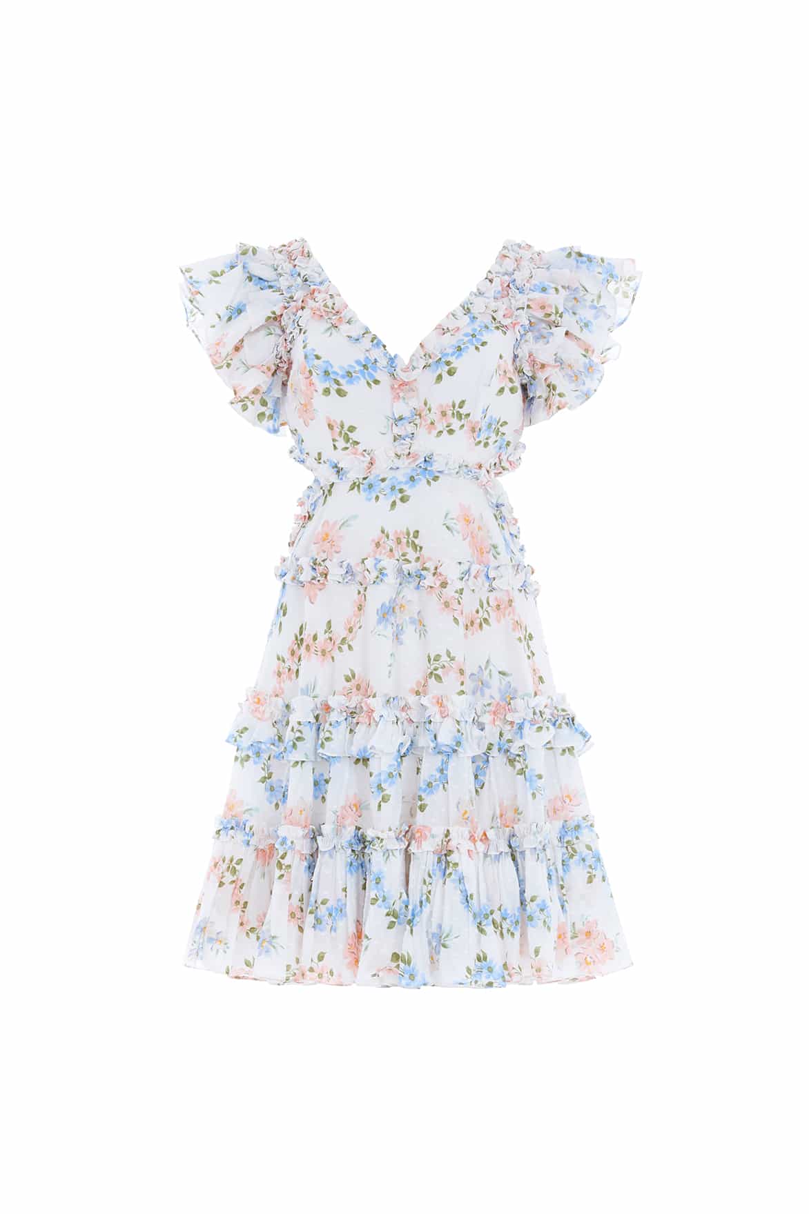 The Dancing Daisies Cotton Backless Micro Mini Dress in Moonshine. This playful print is taken from an early 1900’s hand-painted artwork. Developed with undulating borders of flower motifs to create a floral stripe print in soft pastel shades of pink and blue. Designed with an open back in the most flattering and secure way, with a button finish at the top neck. A transitional day to night piece.