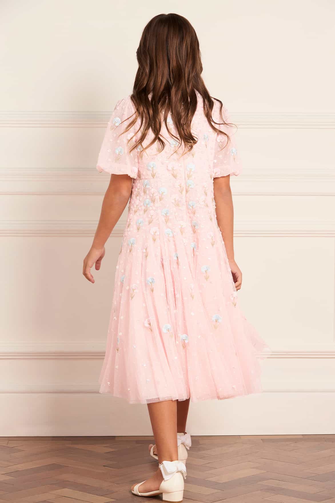 NEW SEASON. The Dandelion Ditsy Kids Dress in Seashell. Sparkles softly with intricate floral embroidery. Designed with a light tulle skirt and delicate ruffles, it’s made for magical, carefree moments. This piece matches the Dandelion Ditsy Ankle Gown from the womenswear line for a timeless coordinated style.