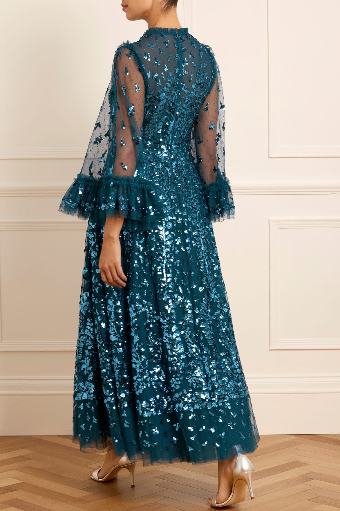 The Fern Ankle Gown in Jewel Blue. Inspired by a historical archive artwork, this gown features a shimmering statement sequin border on the skirt hem with a trailing glittering motif design that disperses towards the dress. Crafted in soft tulle with signature Needle & Thread frills, this luxurious style boasts voluminous sleeves with embellished motifs and romantic frills at the cuffs, adorned with glistening sequins. The sequins have a special high-shine gloss finish created by extra foil coating. The skirt is generously made up of layers of soft, delicate tulle and net. A classic and contemporary style.