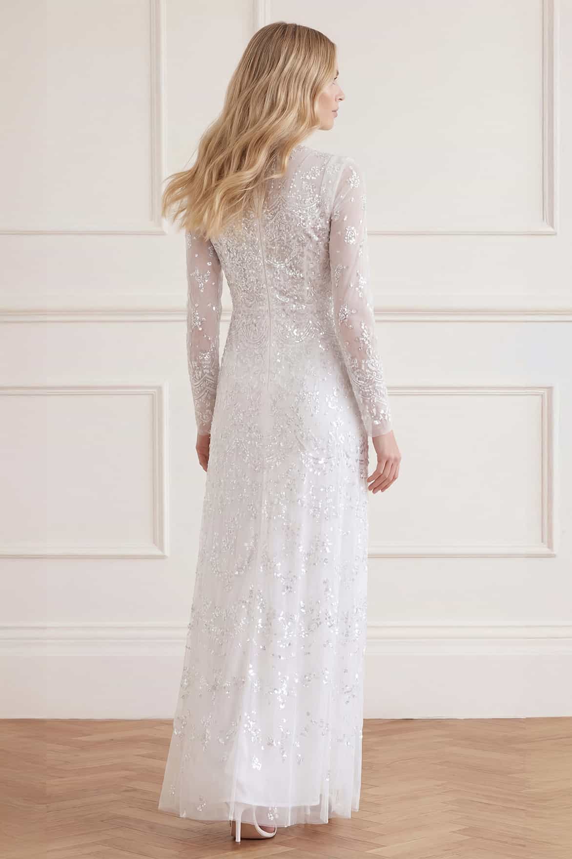 NEW SEASON. The Freya Long Sleeve Gown in Swan White. This statement gown features delicate lace-inspired sequin artwork arranged to create a flattering silhouette. The fitted bodice and elegant long sleeves lead into a flowing full-length skirt with softly dispersed embellishment.