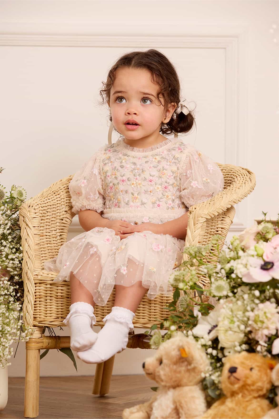 The Garland Ribbon Baby Dress in Cream/Multi. Delicately detailed with floral embroidery and ribbon-inspired motifs. Crafted with soft layers for comfort, this design creates a gentle, playful silhouette with subtle volume.