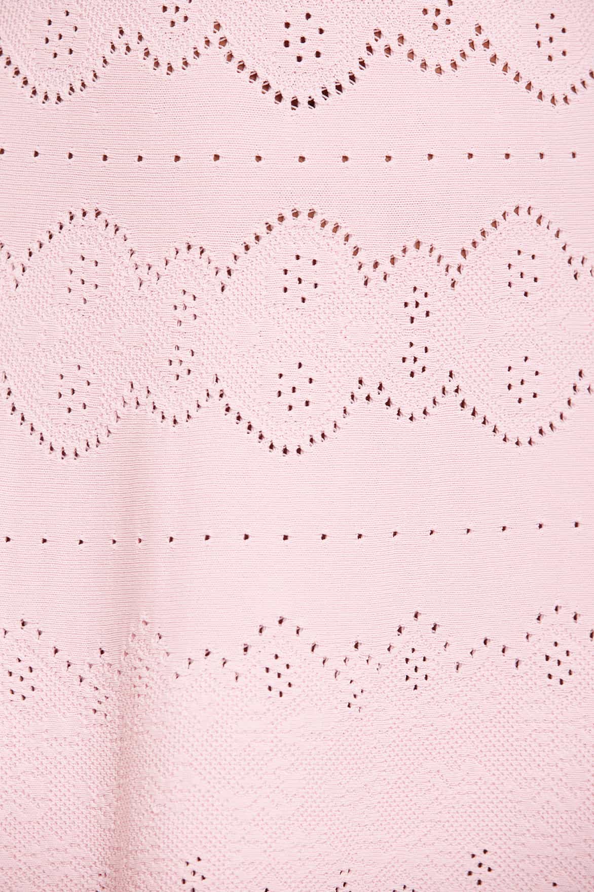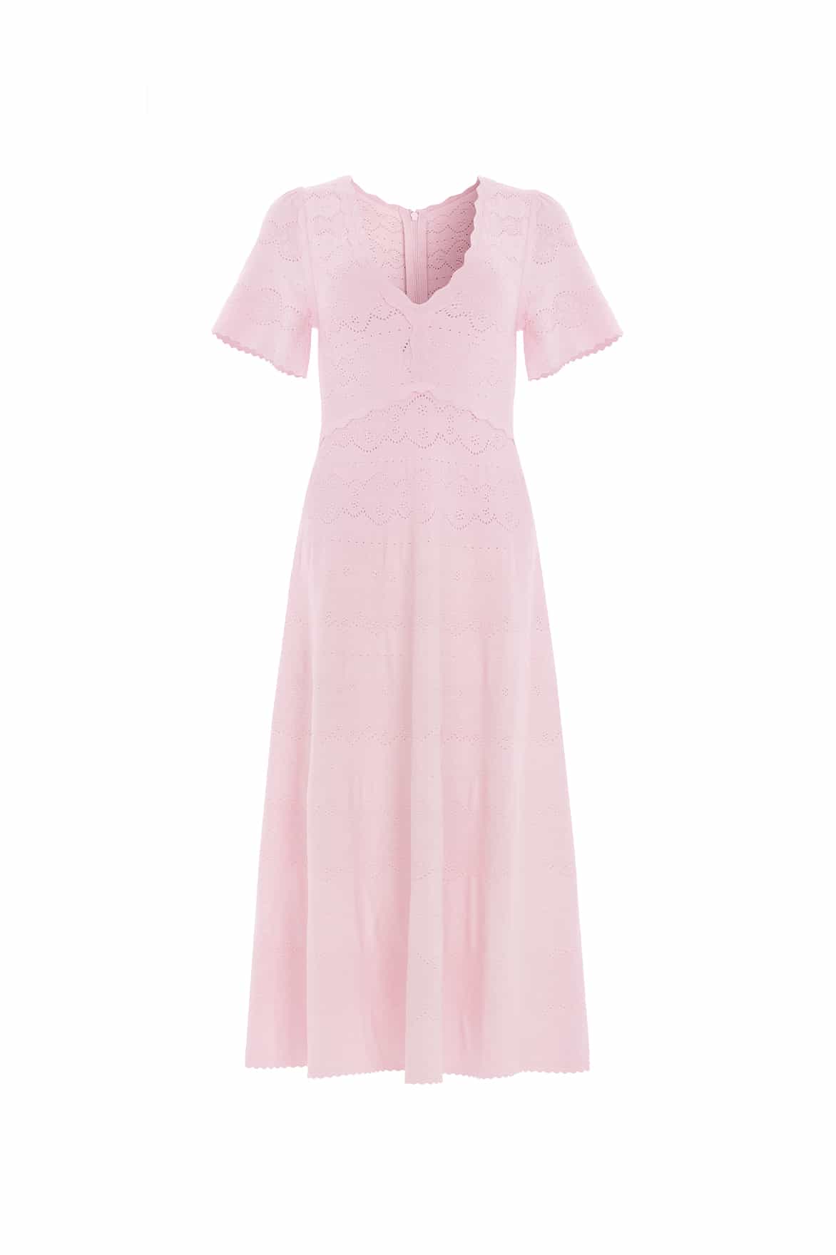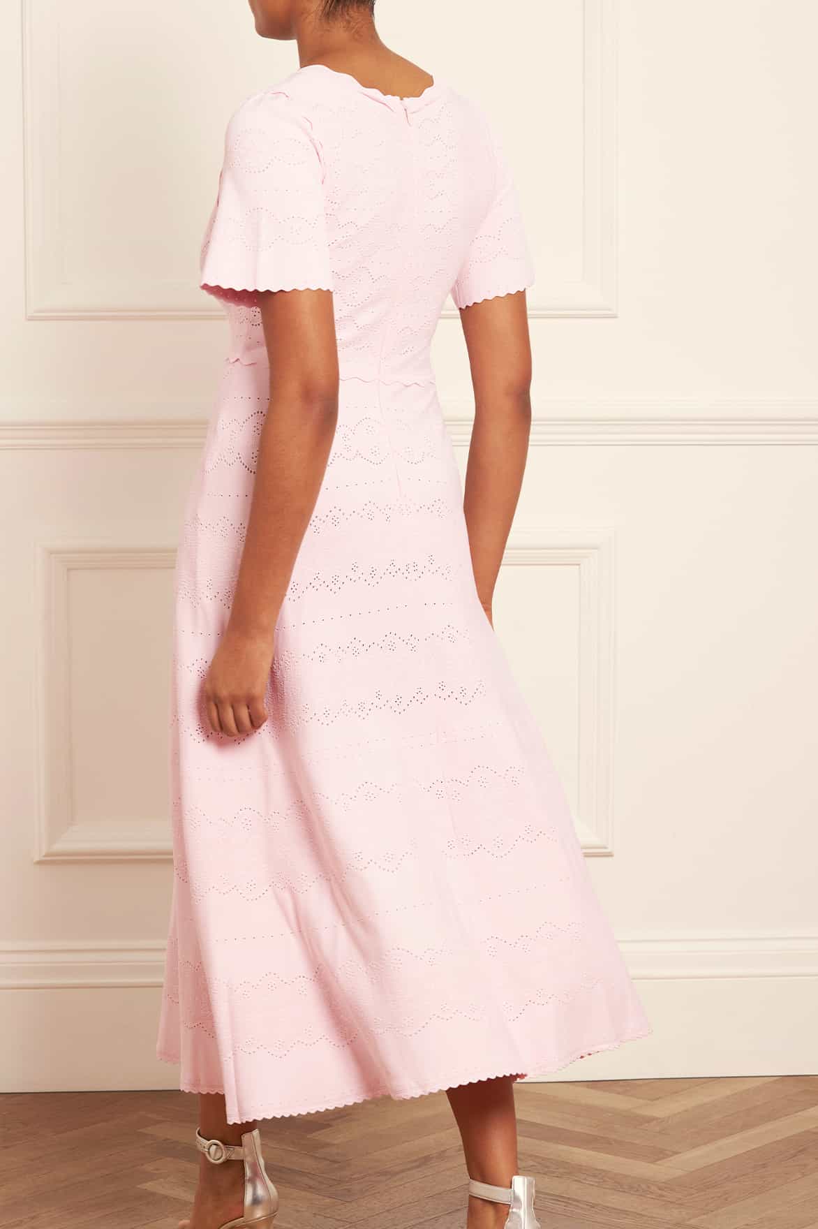 NEW SEASON. The Lace Knit Gown in Peony Pink. This knitted gown is developed from recycled viscose blend, with stretch yarn for a beautiful, flattering texture. Decorated with stitch pointelle details inspired by vintage woven lace ribbons. Crafted with a fitted stretch bodice, a feminine V-neckline and scalloped trim details for a romantic look.