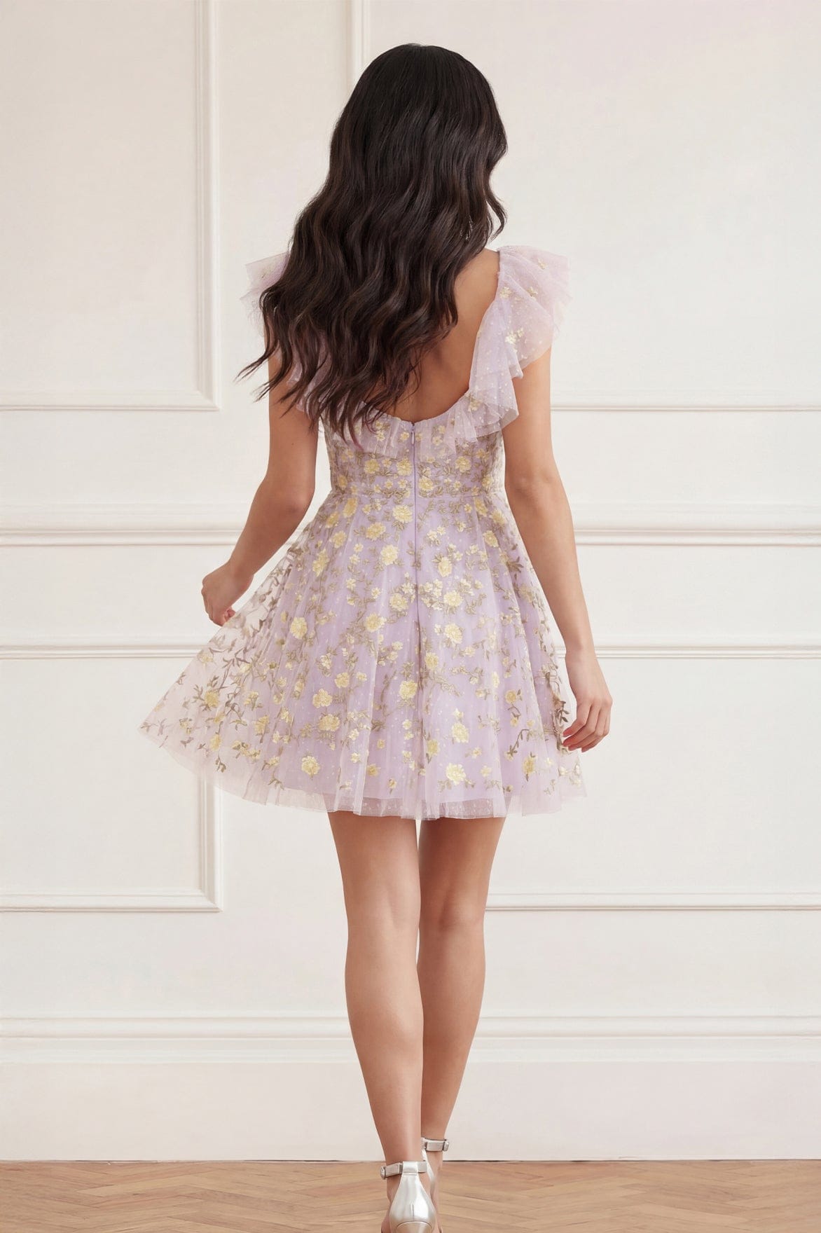 NEW SEASON | NEEDLE & THREAD EXCLUSIVE. The Lea Ditsy Micro Mini Dress in Powder Lilac/Lemon Sorbet. A playful micro mini silhouette adorned with romantic ditsy florals inspired by painted English gardens. Designed for statement dressing, this style offers a light, feminine feel with a modern edge.